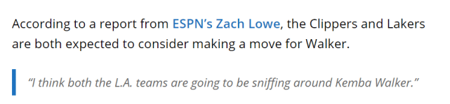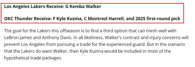 此前,名记斯皮尔斯就曾建议湖人去交易沃克,他在The Jump节目上说道:“如果我是湖人,为什么不去追逐沃克呢?库兹马看上去已经要离开了。”湖人能够用于交易的筹码并不多,库兹马是其中一个。美媒建议湖人送出库兹马、哈雷尔和2025年的首轮签,去换来沃克。