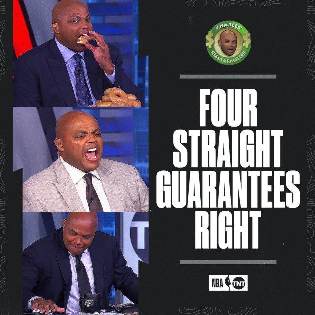 巴克利的预测一向被认为是“毒奶”,往往结局和他预测相反,这样连对四次的场面实在太罕见了。就连TNT电视台,都晒出了一张巴克利连对四次的海报,并调侃道:“我们正在见证历史。”