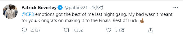 目前贝弗利已经公开道歉,他发推写道:抱歉CP3,当时我的情绪有点失控;那是我的错,但那个行为并不是针对你本人;最后恭喜你进入总决赛,祝你好运!