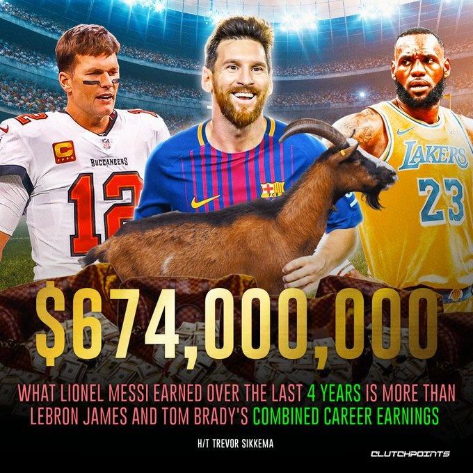 据悉,梅西这4年的薪资收入,比詹姆斯和布雷迪生涯薪资总和还要多,这两人合计39年职业生涯,却不如梅西4年的收入。而且,詹姆斯和布雷迪都是各自领域的代表性人物,从这个方面来看的话,足球的影响力确实独一档,其他体育运动很难相媲美。