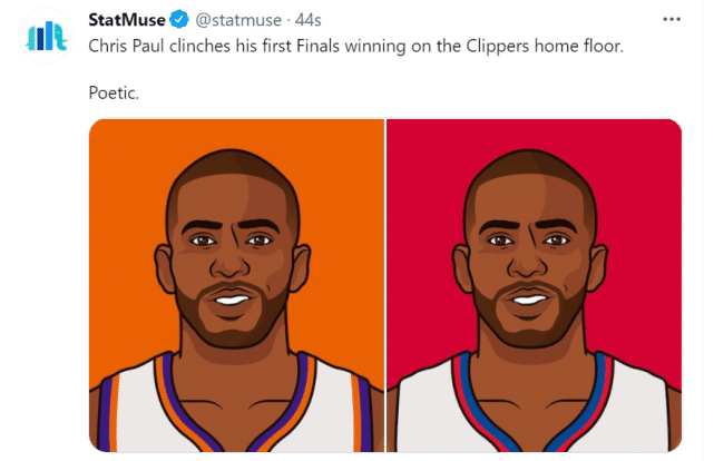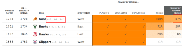在这场比赛前,数据网站FiveThirtyEight为太阳列出的夺冠概率是55%,而淘汰快船后,太阳的夺冠概率已经升至67%,依然排名第一。率先晋级总决赛后,他们将等待雄鹿和老鹰的胜者,东部两队目前战成2-2平。赛后,保罗表示晋级总决赛的感觉棒极了!