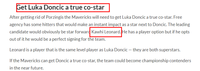 如果能送走波尔津吉斯,独行侠需要为东契奇配备一个真正的球星搭档。美媒认为自由球员市场上有一些很棒的选择,比如快船的莱昂纳德,如果他跳出球员选项,那将是独行侠完美的签约目标。东契奇和莱昂纳德同属超级球星的行列。他俩若能联手,独行侠完全可以很快成为总冠军的有力竞争者。
