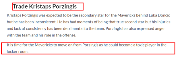 波尔津吉斯本该是独行侠的二当家,但他的表现一直不稳定,而且经常遭遇伤病。今年季后赛,他还对自己在进攻中扮演的角色感到不满。波尔津吉斯和东契奇之间也不是什么朋友关系,美媒认为独行侠是时候和波尔津吉斯分道扬镳了,因为他可能成为更衣室的毒瘤。