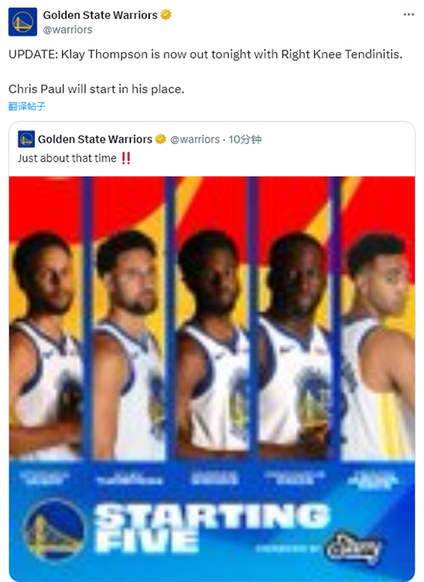 今日对阵黄蜂,勇士官方公布首发五虎——库里、汤普森、维金斯、追梦格林和TJD;仅仅过了6分钟,勇士官宣,克莱-汤普森因右膝肌腱炎临时退出今日比赛,保罗将代替其首发出战。