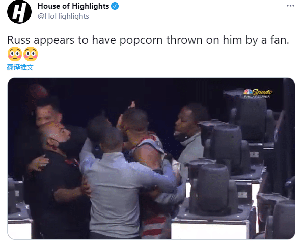就在昨天,威少因球迷向他洒爆米花大发雷霆,最终那个肇事的费城球迷也被终身禁赛了。