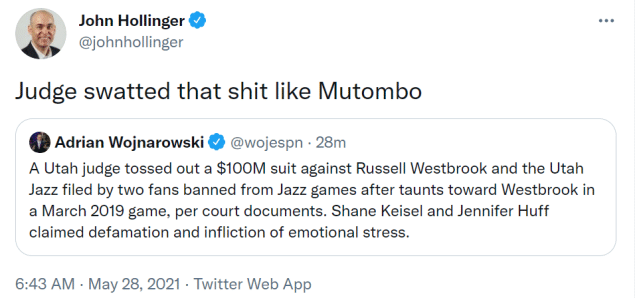 360直播讯 北京时间5月28日,据名记沃纳罗斯基报道,一位犹他的法官驳回了两位球迷对威斯布鲁克和爵士高达1亿美元的索赔。这两位球迷曾在2019年3月的一场比赛中和当时效力雷霆的威少发生争吵。随后,他们俩已经被爵士禁止现场观赛。两位球迷随后提出诉讼,把威少和爵士告上法庭,理由是自己受到了诽谤与精神困扰。