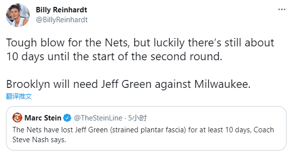 杰夫-格林至少伤停10天,他的缺席是篮网队的一大损失,因为格林能在场上担任多个位置以及扮演不同的角色,尤其是他的防守能力;系列赛前两场,格林场均上场19.5分钟拿到4.5分2篮板1.5助攻,在场正负值+11,但愿格林早日痊愈。