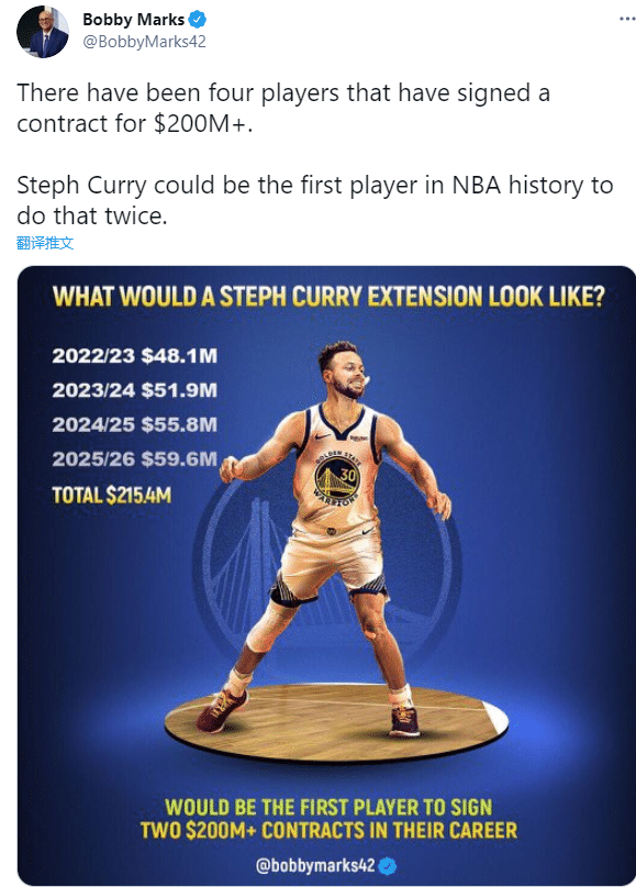 360直播讯33岁库里还能拿到一份顶薪大合同吗?据薪资专家Bobby marks分析,库里有可能和勇士续签一份4年2.15亿美元的超级顶薪,若成功续签2亿顶薪,库里将会成为NBA历史上第一位拿到两份2亿顶薪的球员。
