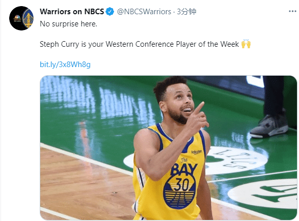 勇士官方连续更新动态,恭喜库里再次当选西部周最佳球员,官推写道:毫无悬念以及多么令人惊叹的数据。