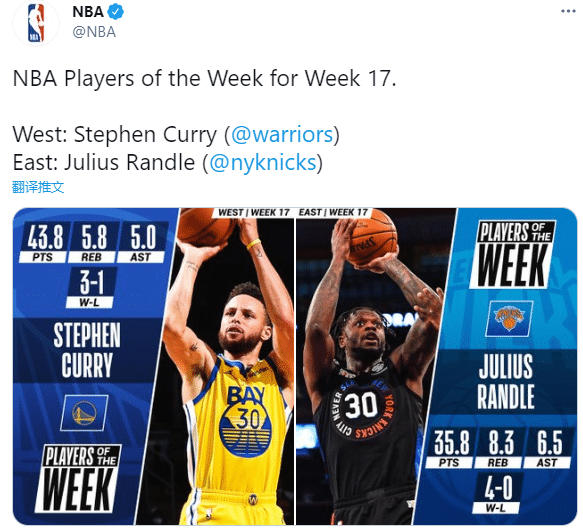 360直播讯 北京时间4月20日,NBA联盟官宣本赛季第17周东西部周最佳球员,尼克斯球星兰德尔首夺东部最佳,上周场均35.8分83篮板6.5助攻,带队4胜0负,已成纽约新王;勇士球星库里再次当选,场均狂砍43.8分太疯狂,当选西部周最佳真乃实至名归。