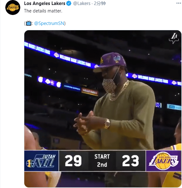 360直播讯 湖人和爵士比赛中,詹姆斯因伤继续缺席比赛,继续坐在场边为队友加油打气,期间詹姆斯突然变身詹指导,穿金戴钻十分抢镜,站在湖人替补席指导队友,湖人官方晒出这一幕,发推写道:细节很重要;球迷调侃不好好管理饮水机,居然兼职教练了。