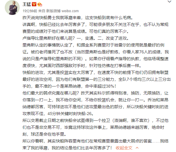 知名篮球人王猛也在社交媒体上点评快船,他盛赞这支球队和他们的主帅,称现任主帅泰伦卢比前任老里弗斯好,泰伦卢的临场调整速度很快,进攻端在速度不快的前提下他们仍旧拥有联盟最好的进攻空间,同时还让快船拥有联盟第一的三分球命中率。当然这支快船也有弱点,王猛称对手无限换防之后快船只能1打1,效率相对一般。而快船也会试图得到一名控卫,比如洛瑞,当然也并非是必须要引进球员,快船整体比去年强多了。