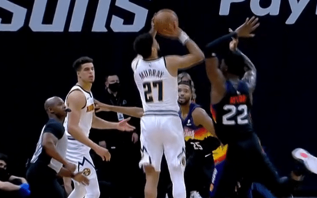 这场比赛裁判吹罚出现了严重漏判,第四节的比赛最后一攻,太阳队当时领先掘金队3分,他们有很大的可能去赢下比赛,只要防好掘金队的三分投射即可,掘金队最后一攻,穆雷接到约基奇手递手传球,穆雷撤到了三分线外超高难度的三分投射命中,这才有了后来的比赛进入加时,掘金逆转取胜。
