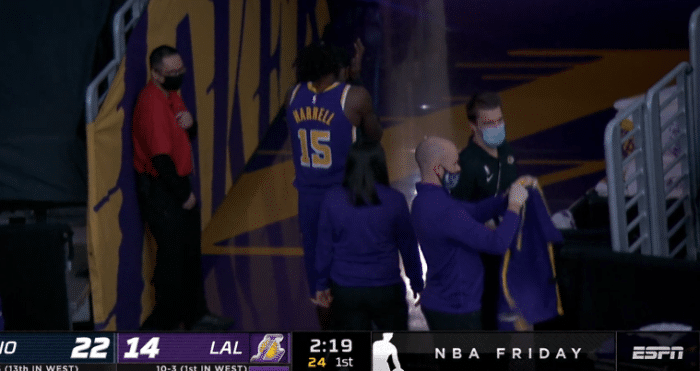 首节2分19秒,锡安持球杀到禁区上篮时肘击到哈雷尔头部,浓眉背后大帽锡安,可哈雷尔不幸受伤离场,当时哈雷尔被天生神力的锡安直接打懵了,哈雷尔嘴巴瞬间变形,哈雷尔首节替补仅上场打了1分钟被迫返回更衣室,所幸哈雷尔伤无大碍,第二节重返赛场。