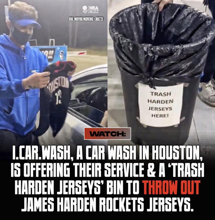 不久前,休斯敦当地某洗车店推出一项活动,用旧的哈登球衣可以换一次免费洗车,一美女拿哈登火箭13号球衣到洗车店,只见洗车员拿过球衣后直接把哈登的球衣丢进垃圾桶;如此视频瞬间引热议,哈登球迷被仍旧垃圾桶,由此可以看出火箭球迷的心情。