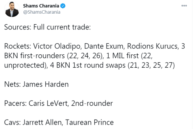 360直播讯 北京时间1月14日,一笔关于哈登的四队大交易正式达成!篮网得到哈登,火箭得到奥拉迪波、埃克萨姆、库鲁茨、4个首轮和4次选秀互换权,步行者得到勒维尔和一个次轮签,骑士得到贾内特-阿伦和普林斯。