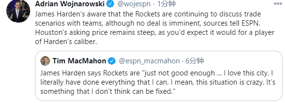 随后ESPN名记表示哈登知道火箭正在积极和别的球队谈判,只不过火箭要价太高,一直想要离队的哈登没有实现自己的想法;开赛前三场比赛,哈登得分还是很恐怖的,不过最近几场比赛,哈登得分呈现直线下降,这被认为是哈登不满球队,想通过这样的方式逼宫火箭赶紧交易自己。