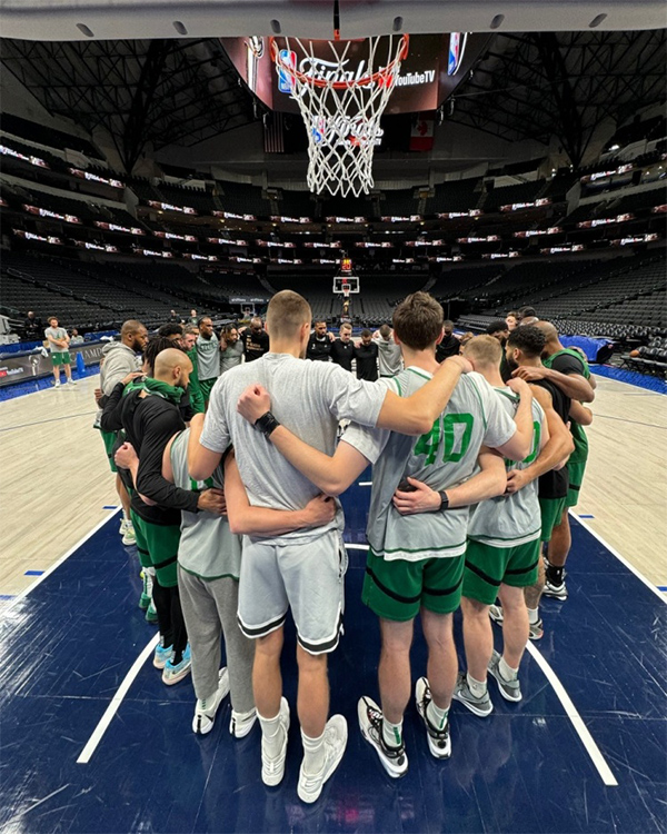 从绿军官方晒出的训练照可以看出,杰伦-布朗身穿黑色卫衣,面带笑容十分轻松;塔图姆与霍福德一起交流,绿军主帅马祖拉抱着篮球与怀特开心畅聊,霍乐迪搂着怀特和普里查德,波尔津吉斯参加了一些训练;训练后全队围在一起并且喊口号,目标自然是明天夺冠。