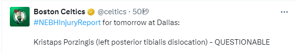 波尔津吉斯的出战状态已经升级为出战成疑,他有望G4复出帮助球队夺得总冠军;昨天波津因左胫后肌腱脱位而缺席比赛,明天G4冠军点,他有机会重返赛场,而且波津渴望出战这场有机会决定总冠军归属的比赛。
