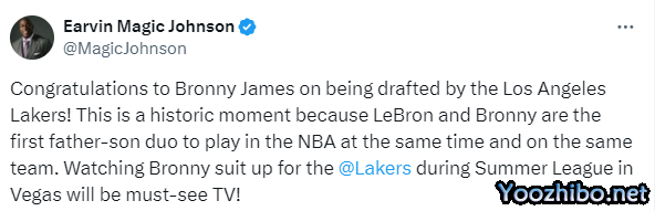 NBA名宿魔术师约翰逊更推道:“恭喜布朗尼-詹姆斯被湖人选中。这是一个历史性的时刻,因为勒布朗和布朗尼是NBA历史上第一对同时在同一支球队打球的父子。看布朗尼穿湖人球衣打夏季联赛将是必看节目