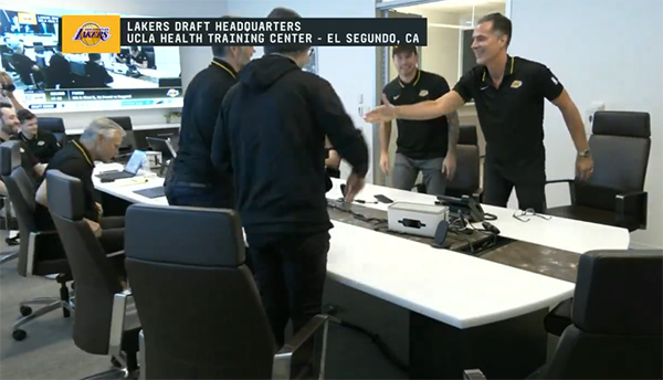 从次轮选秀开始,湖人一直等着选布朗尼,苦等两个小时,最终如愿选中布朗尼;湖人作战室庆祝曝光,佩林卡打电话敲定选择布朗尼,全员鼓掌庆祝,佩林卡与众人击掌,早已笑得合不拢嘴,湖人新帅雷迪克同样十分开心。