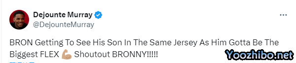 老鹰球星德章泰-穆雷更推道:勒布朗看到他的儿子穿着和他一样的球衣将是最大的欣慰。向布朗尼致敬!