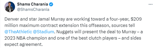名记shams报道,掘金和贾马尔-穆雷正在努力争取在这个休赛期达成一份4年2.09亿的顶薪提前续约合同,掘金将向穆雷开出这份4年2.09亿美元的顶薪合同,双方预计会达成协议,穆雷是2023年总冠军得主和最出色的关键球员之一。