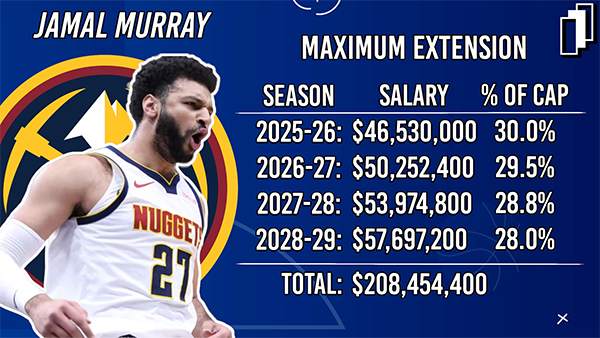 穆雷与掘金合同还剩下一年,2024-25赛季的年薪为3601万美元,据NBA薪资专家Yossi Gozlan报道,若明夏续约,穆雷有资格续签5年2.69亿美元的大合同。