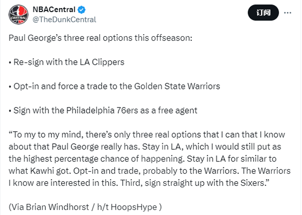 Windhorst还列为保罗-乔治在休赛期的三个真正选择: 1、 与洛杉矶快船队重新签约 ;2、执行球员选项并申请交易至勇士队 •;3、以自由球员身份与费城76人队签约 ;该记者表示:在我看来,保罗-乔治真正拥有的选项只有三个。留在洛杉矶,我仍然认为这是发生的可能性最高。留在洛杉矶的待遇与科怀的待遇差不多。执行选项并申请交易,可能是去勇士队。我知道勇士队对此很感兴趣。第三,直接与76人队签约。