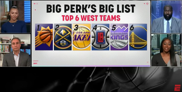 帕金斯在节目《NBA Today》中列出了自己心目中的新赛季西部Top6,这6支球队依次排名为:太阳、掘金、湖人、快船、国王、勇士。