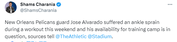 360直播09月18日,据名记shams报道,鹈鹕后卫阿尔瓦拉多在本周的一次训练中遭遇脚踝扭伤,是否能参加新赛季的训练营存疑;新赛季还没开打,鹈鹕接连遭遇伤病,阿尔瓦拉多扭伤脚踝归期未定,墨菲更是因伤预计伤停10-12周。