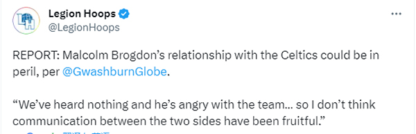 目前布罗格登和凯尔特人之间的关系可能处于危险之中,GaryWashburn透露,我们没听到双方有任何交流,他仍然对球队生气,我认为他们双方之间的沟通没有取得成效,他对交易的结果很不满意。