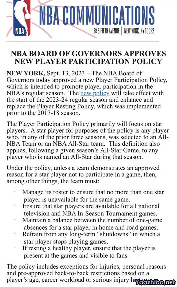 6、这项新政还包括伤病、个人原因的例外情况,以及根据球员年龄、职业生涯工作量或者是严重伤病史而预先批准的背靠背限制。