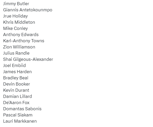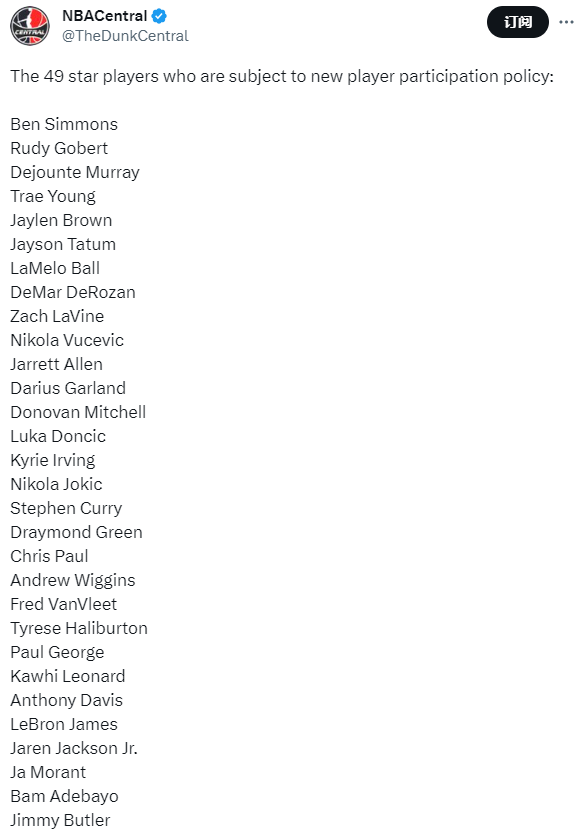 美媒列49名受到轮休新规限制的球星——保罗·乔治、科怀·伦纳德、安东尼·戴维斯、勒布朗·詹姆斯、太阳比尔、杜兰特、德文·布克、本·西蒙斯、鲁迪·戈伯特、德章泰·穆雷、特雷·杨、杰伦·布朗、杰森·塔图姆、拉梅洛·鲍尔、德罗赞、扎克·拉文、尼古拉·武切维奇、贾雷特·艾伦、加兰、多诺万·米切尔、卢卡·东契奇、凯里·欧文、尼古拉·约基奇、斯蒂芬·库里、德雷蒙德·格林、克里斯·保罗、安德鲁·威金斯、弗雷德·范弗里特、泰瑞斯·哈利伯顿、小贾伦·杰克逊、莫兰特、阿德巴约、吉米·巴特勒、字母哥、朱·霍乐迪、米德尔顿、迈克-康利、安东尼-爱德华兹、卡尔-唐斯、锡安·威廉森、朱利叶斯·兰德尔、雷霆亚历山大、乔尔·恩比德、詹姆斯太阳比尔、杜兰特、德文·布克、哈登、利拉德、福克斯、小萨博尼斯、马尔卡宁和西亚卡姆。