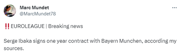 360直播09月14日,杜兰特前队友离开NBA,据欧洲记者Marc Mundet报道,自由球员塞尔吉-伊巴卡与德国篮球俱乐部拜仁慕尼黑签订1年合同,新赛季伊巴卡将转战欧洲联赛。