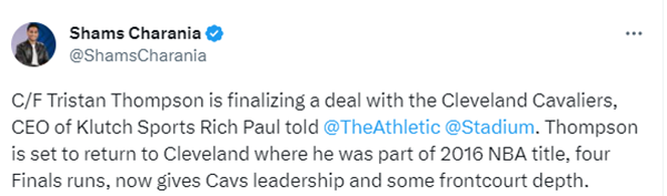 北京时间9月12日,据名记shams报道,经纪人里奇-保罗透露,骑士将与特里斯坦-汤普森签约,下赛季他将重回骑士;TT能为骑士带来一些领导力和前场阵容深度;据悉他们双方签下1年不分保障合同,骑士将以14+3名单开启新赛季。
