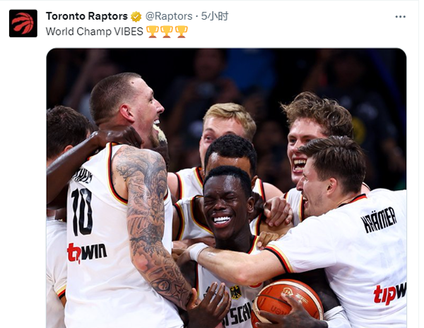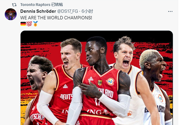 猛龙官方社媒晒出了施罗德的夺冠海报,写道:“FIBA世界杯冠军,丹尼斯-施罗德。”转发了施罗德当选MVP的消息,配文是:“他是一名猛龙球员。”