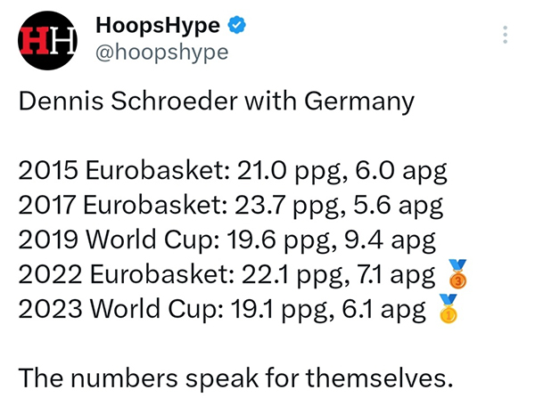 美媒HoopsHype晒出了施罗德随德国参加国际赛事的数据:2015年欧锦赛场均21分6助攻;2017年欧锦赛场均23.7分5.6助攻;2019年世界杯场均19.6分9.4助攻;2022年欧锦赛场均22.1分7.1助攻+铜牌;2023年世界杯场均19.1分6.1助攻+金牌。国际赛场上的施罗德,确实相当了得。