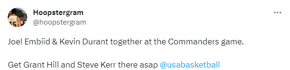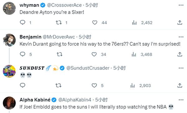 杜兰特、恩比德同框看比赛引热议,有球迷调侃:是时候和艾顿说再见了;有球迷表示如果恩比德加盟太阳,我再也不会看NBA 了;还有球迷调侃:格兰特-希尔和科尔赶紧过去(邀请他们加入美国男篮)。