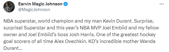 杜兰特还身穿指挥官队99号球衣和湖人名宿魔术师合影,恩比德、76人老板也和魔术师合影;值得一提得是,此前约什-哈里斯和魔术师一起斥资收购了华盛顿指挥官队,收购价格高达60.5亿美元。