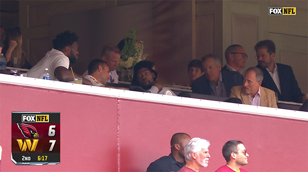 戴着小黑帽的杜兰特和恩比德一起坐在华盛顿指挥官队的老板席观看比赛,杜兰特和别人有说有笑聊得很开心,恩比德坐在一旁,之后他也扭头和别人互动;76人老板约什-哈里斯盯着他们看,似乎对杜兰特的谈话很感兴趣。