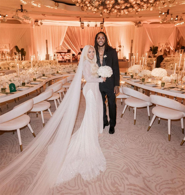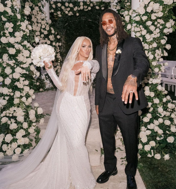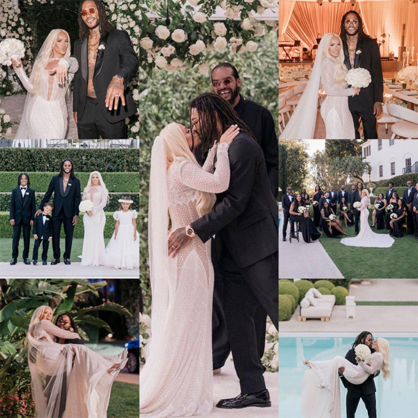 34岁的罗斯身穿一套黑色礼服,留着一头小脏辫、戴着墨镜且敞开西装,如此打扮真是太潮了;阿莱娜则是身穿婚纱,相恋7年后他们终于修成正果,诺阿为罗斯主持婚礼。