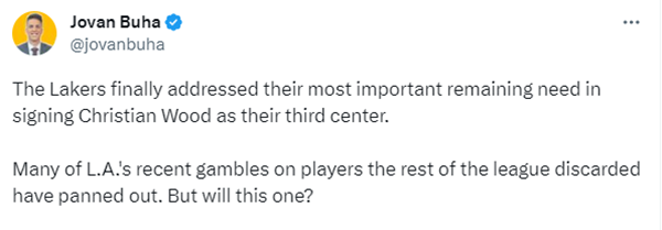 DanWoike则表示伍德加入了一支准备赢球的球队,他们显然需要一个替补出场的得分型大个子。角色接受程度是伍德的一个问题,这也是造成他疲软的市场价值的因素之一;他应该得到充分的机会来展示自己的长处,虽然最初他将为湖人替补出场,但浓眉的伤病问题和詹姆斯的年龄问题,应该会让他在很多比赛中获得重用。