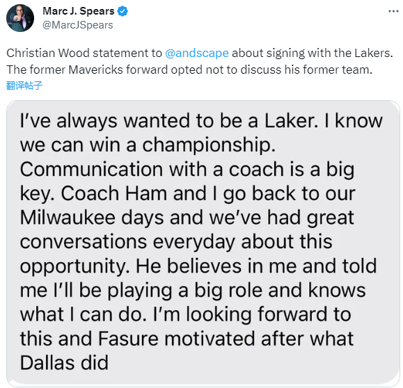 伍德加盟后发表声明,表示:我一直想成为湖人的一员,我知道我们能赢得冠军。与教练的沟通很关键,哈姆教练让我回想起我们曾经在密尔沃基合作的日子,我们每天都在谈论这个机会(在洛杉矶再次合作)。哈姆教练相信我,告诉我能在湖人发挥重要作用,他知道我能做到什么。我很期待这段新的旅程,我在达拉斯的表现让我变得更加有动力。