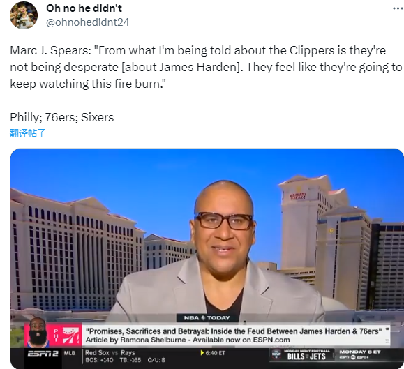 360直播09月07日,名记Marc J. Spears在节目中透露,目前快船并不急于追求哈登,他们打算继续看戏,等着打劫76人;Spears表示:从我被告知的情况来看,快船对于这个情况并不着急,他们想要看(76人与哈登之间的)火继续燃烧下去,然后等一个用几毛钱零钱换百元大钞的机会。