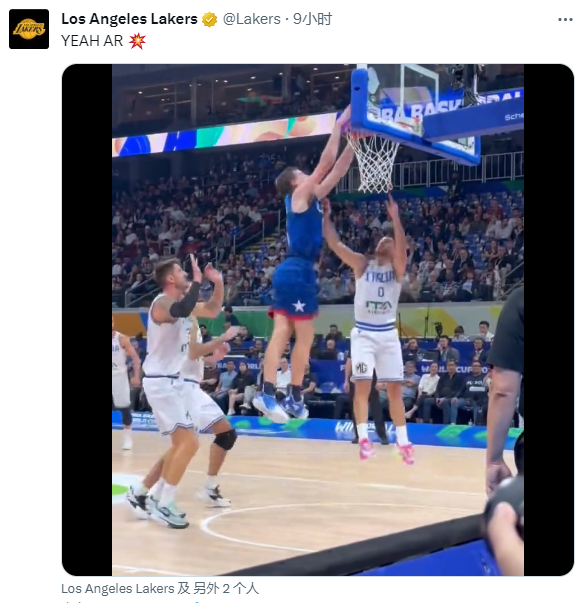 值得一的是,湖人新星里夫斯在与意大利的比赛中上演疯狂补扣,湖人官方狂赞里夫斯炸裂,詹姆斯转发扣篮视频并且配文写道:那个男人。