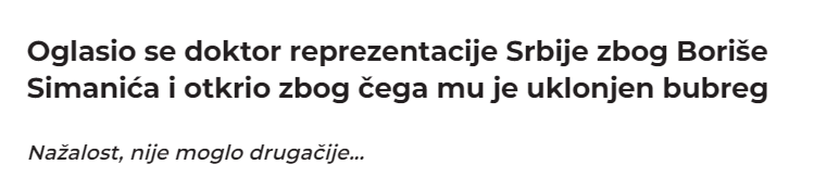 塞尔维亚媒体Telegraf.rs进一步报道,西马尼奇最开始是在8月30至31日的夜间接受了手术;塞尔维亚篮协当时的公告也表示西马尼奇在术后感觉良好,同时肾脏和所有功能均得到保留。当时看起来一切都会好起来,但不幸的是,术后恢复带来了一些问题。