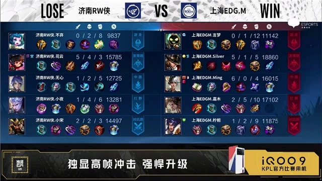 第一局双方常规开局。1分41秒济南RW侠对抗路击杀盾山拿下一血。3分35秒上海EDG.M中路击杀周瑜。5分49秒上海EDG.M对抗路击杀镜。6分22秒上海EDG.M拿下暴君。7分30秒野区团上海EDG.M打出2换3。7分58秒上海EDG.M摧毁敌方发育路外塔。8分07秒上海EDG,M摧毁敌方中路外塔。8分58秒上海EDG.M拿下先知主宰。10分36秒上海EDG.M野区击杀猪八戒。11分12秒上海EDG.M拿下暗影主宰。11分33秒济南RW侠拿下暗影暴君。11分52秒上海EDG.M摧毁敌方对抗路二塔。12分40秒发育路团上海EDG.M打出1换2。13分09秒上海EDG.M摧毁敌方发育路二塔。14分23秒济南RW侠摧毁敌方对抗路外塔。14分57秒上海EDG.M拿下暗影主宰。16分17秒上海EDG.M摧毁敌方中路二塔。16分40秒上海EDG.M摧毁敌方发育路高地塔。17分25秒双方野区1换1。18分25秒上海EDG.M拿下暗影暴君。18分45秒上海EDG.M拿下暗影主宰。20分58秒济南RW侠中路击杀姜子牙。21分40秒中路团济南RW侠打出0换3,随后摧毁敌方中路外、二塔。22分30秒济南RW侠摧毁敌方中路高地塔。22分44秒济南RW侠拿下风暴龙王。23分53秒济南RW侠摧毁敌方发育路高地塔。25分20秒中路团济南RW侠打出1换4。25分57秒济南RW侠摧毁敌方水晶拿下比赛。