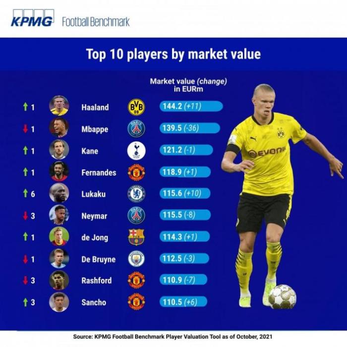 360直播10月16日讯 消息,全球知名审计机构毕马威近日更新了足坛身价排名,哈兰德以1.442亿欧上升一名至第一。