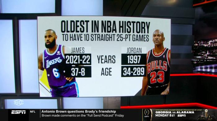 第三、37岁詹姆斯连续10场25+刷新NBA历史最年老纪录,超越乔丹在1997年创造的历史纪录,当时乔丹34岁。